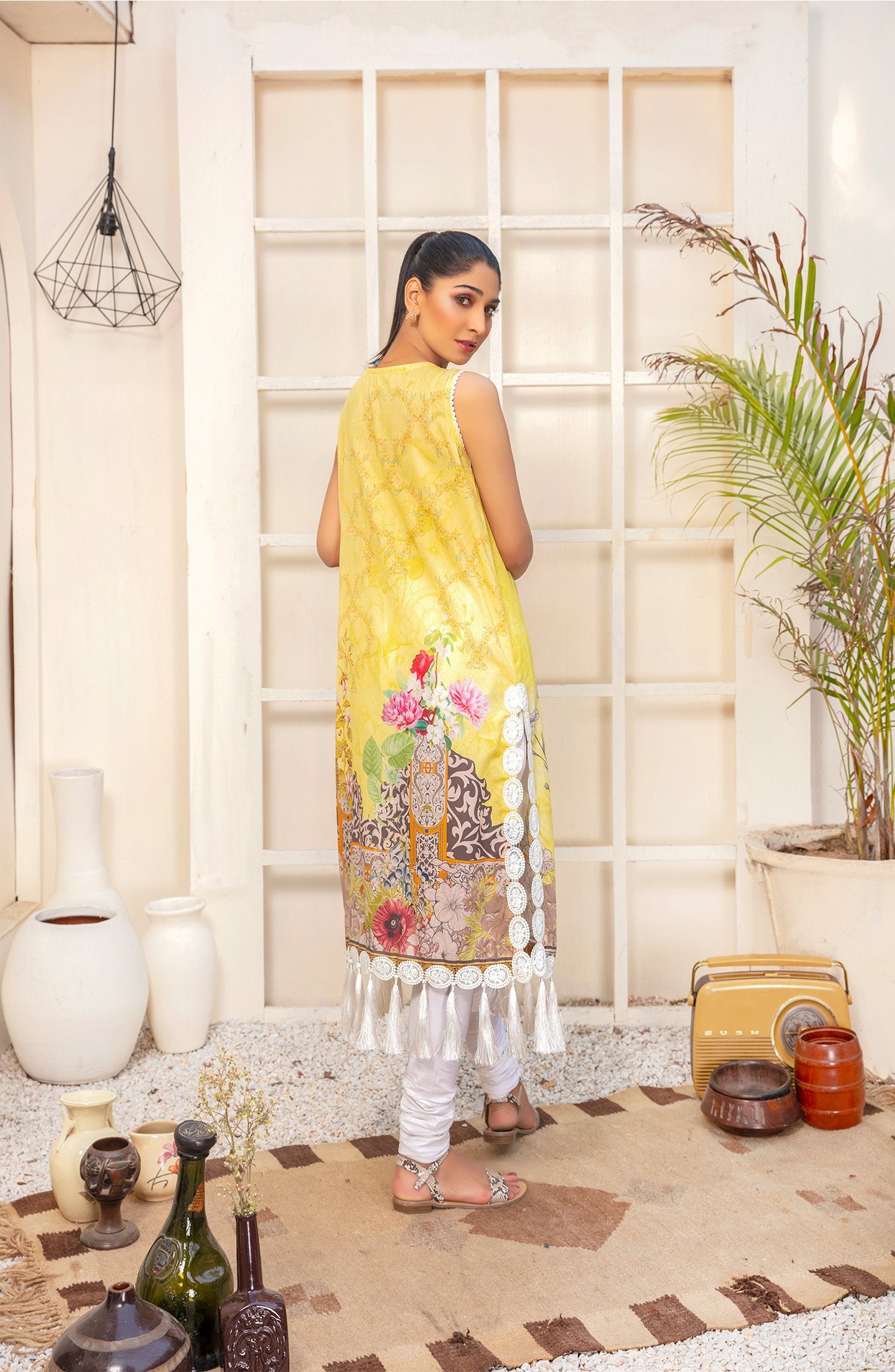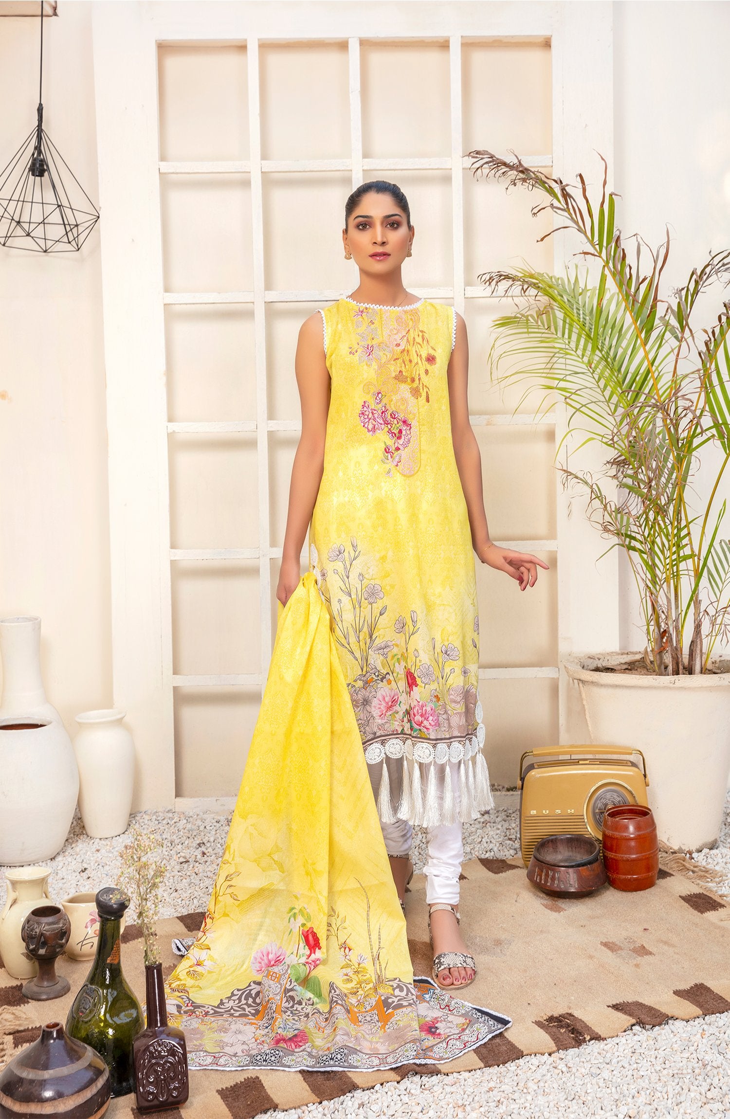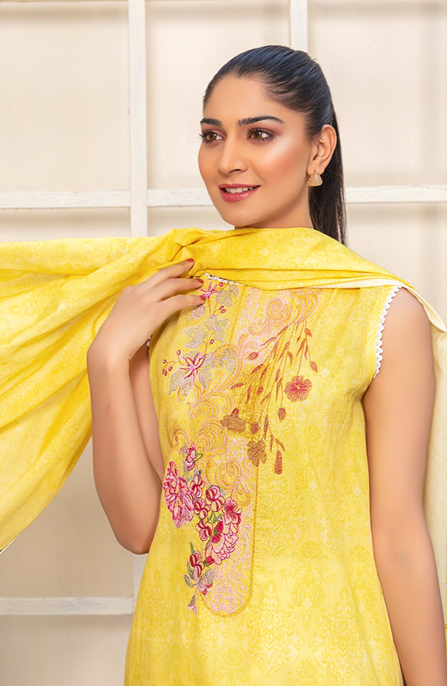 Description: Enjoy perfect summer vibes with bright yellow hues and attractive prints in a fancy lawn 3 piece suit.