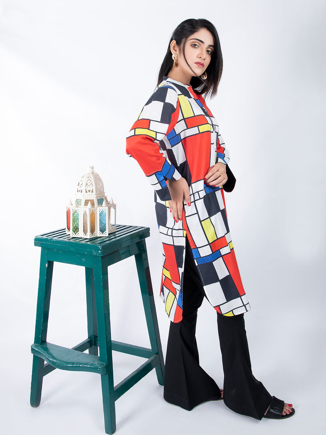 Exude your quirky self with this fun, geometrical patterned kurta in bright summery colors on a plain white canvas with slit sleeves and a slit Y shaped collared neckline.