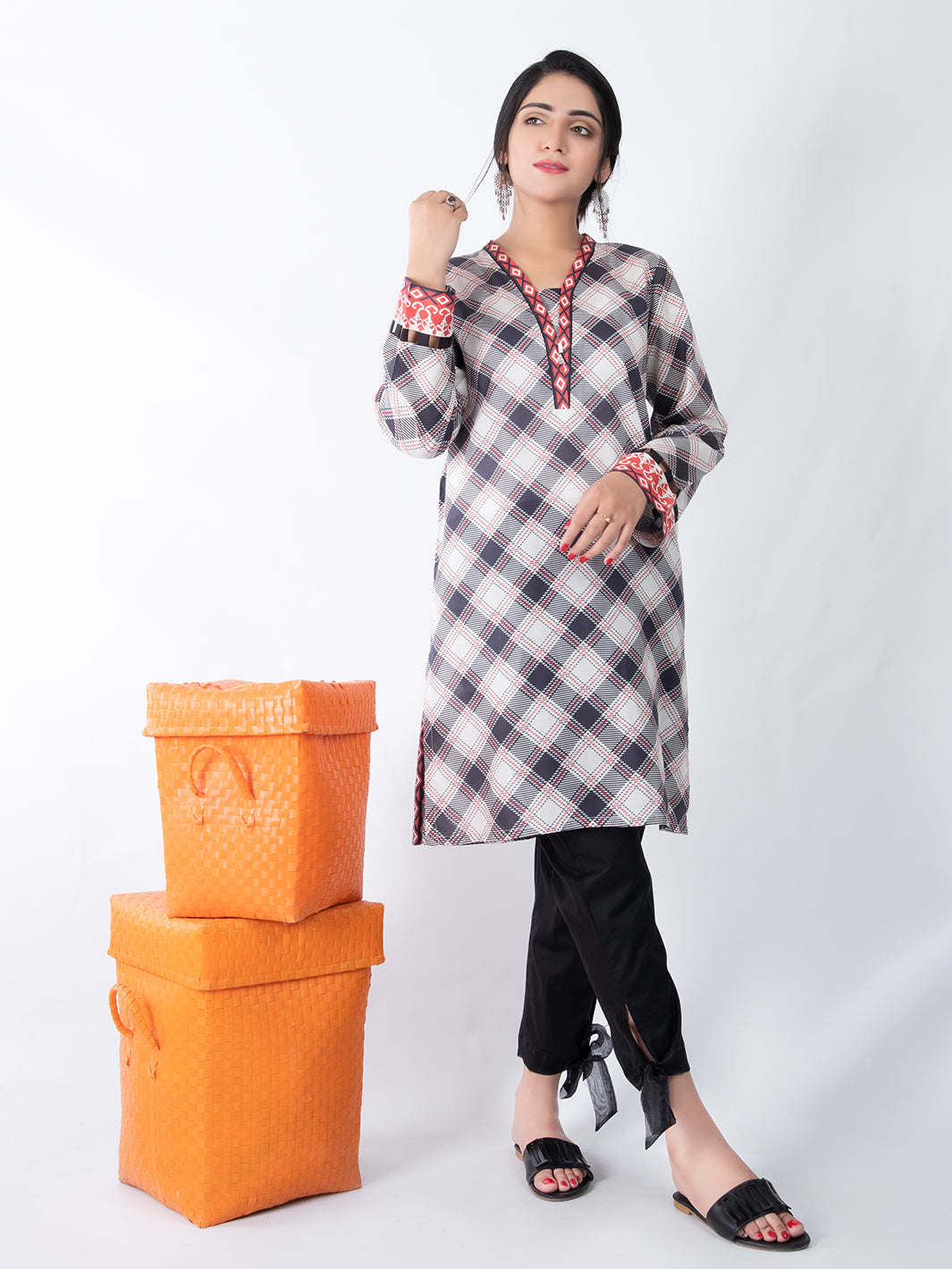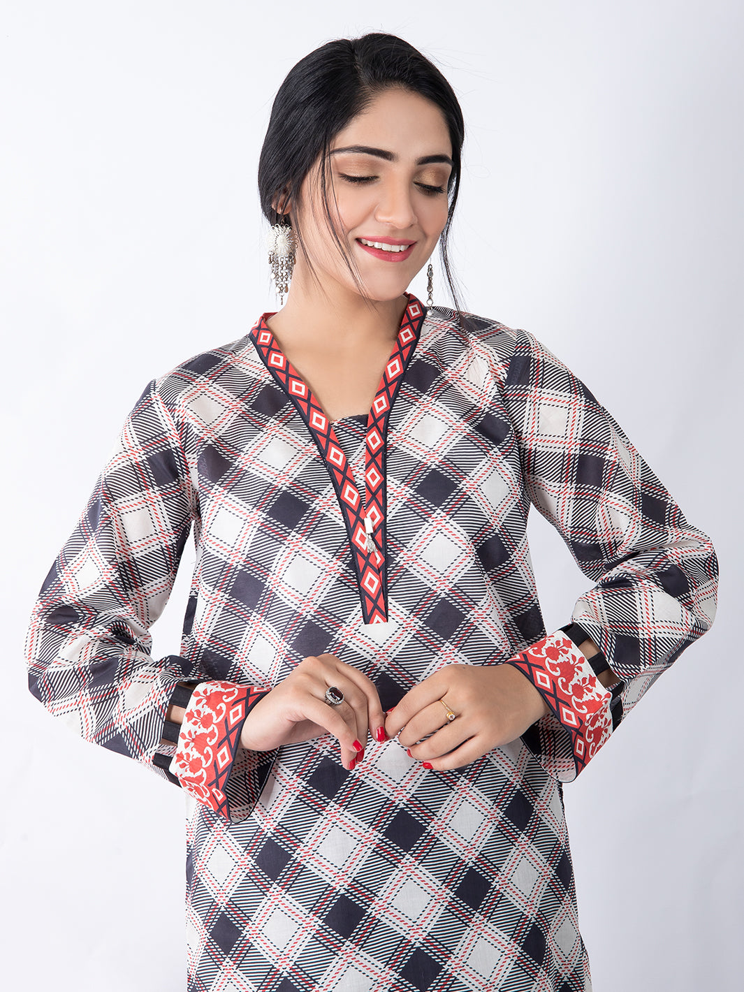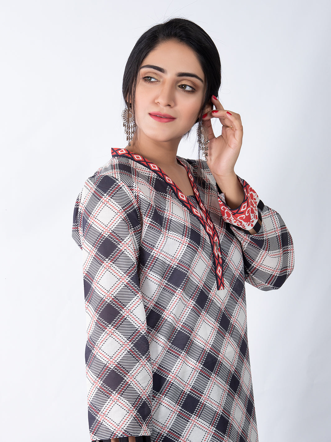 Printed medium length plaid styled shirt with cut-out detailing on sleeves and a straight loose-fitted silhouette.