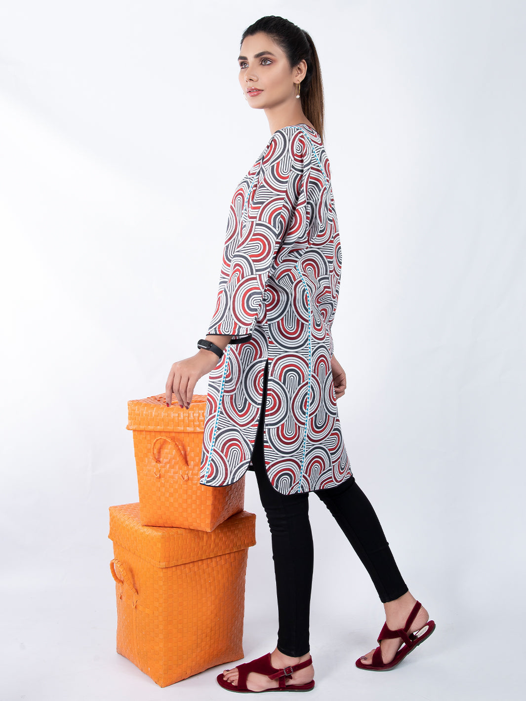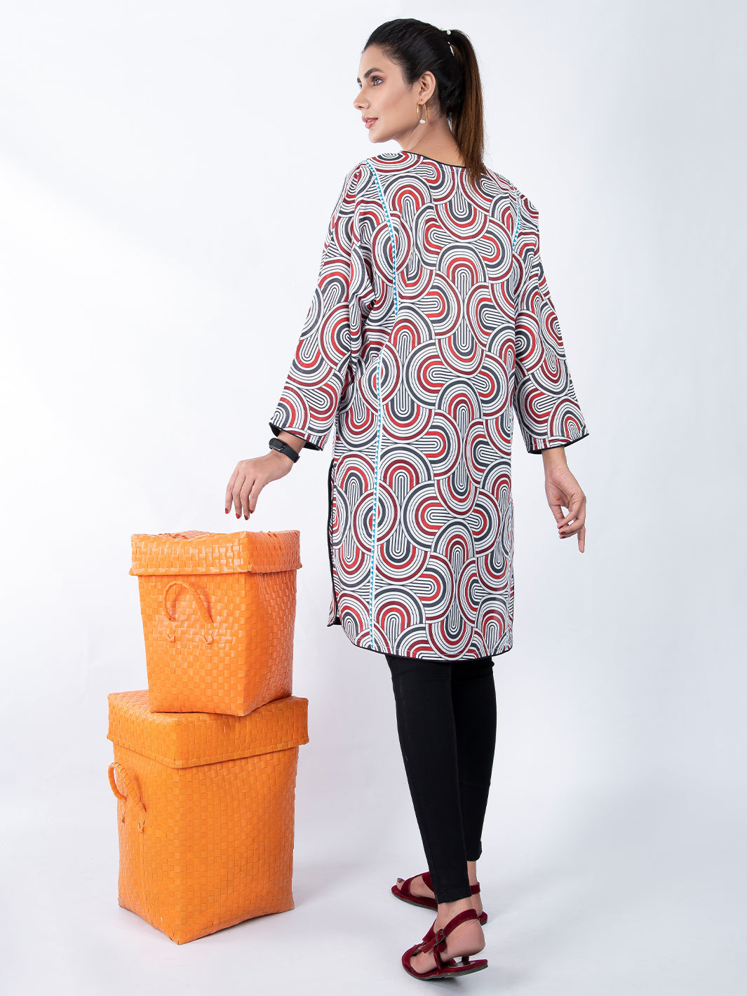 A short length printed kurta imbued in abstract patterns, styled in front and back paneling and designed in contemporary silhouette with a round hemline and comes with matching black bottoms.